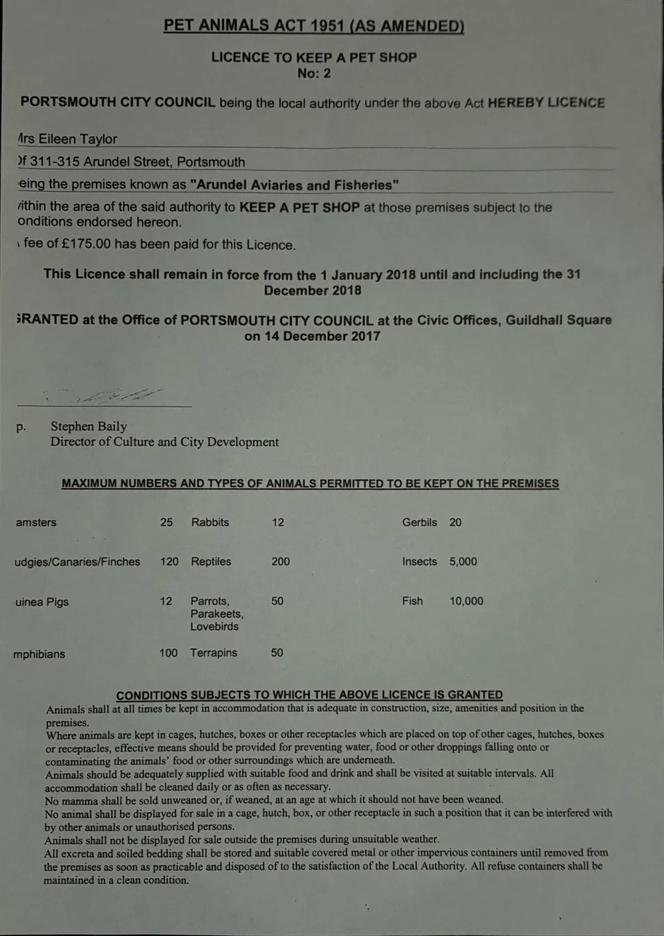 Arundel Aviaries and Fisheries Limited, registered as a limited company in [England and Wales] under company number: 01185797. Registered Company Address: 311/315 Arundel Street, Portsmouth, Hampshire, England, P01 1NJ